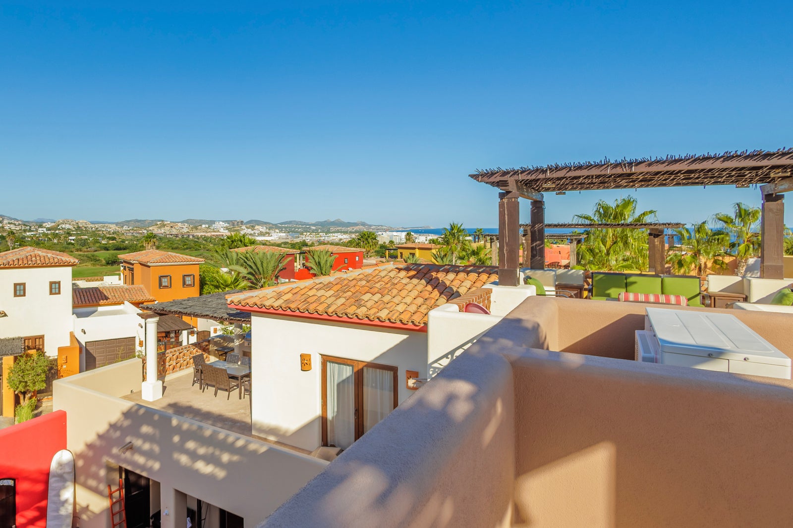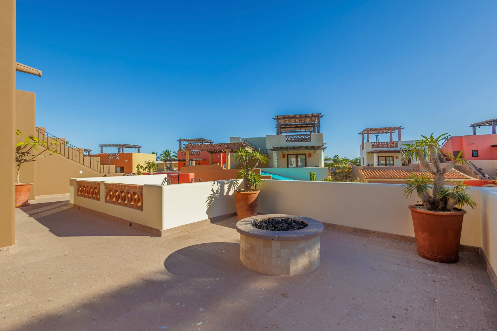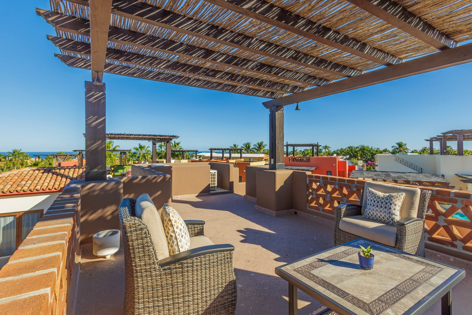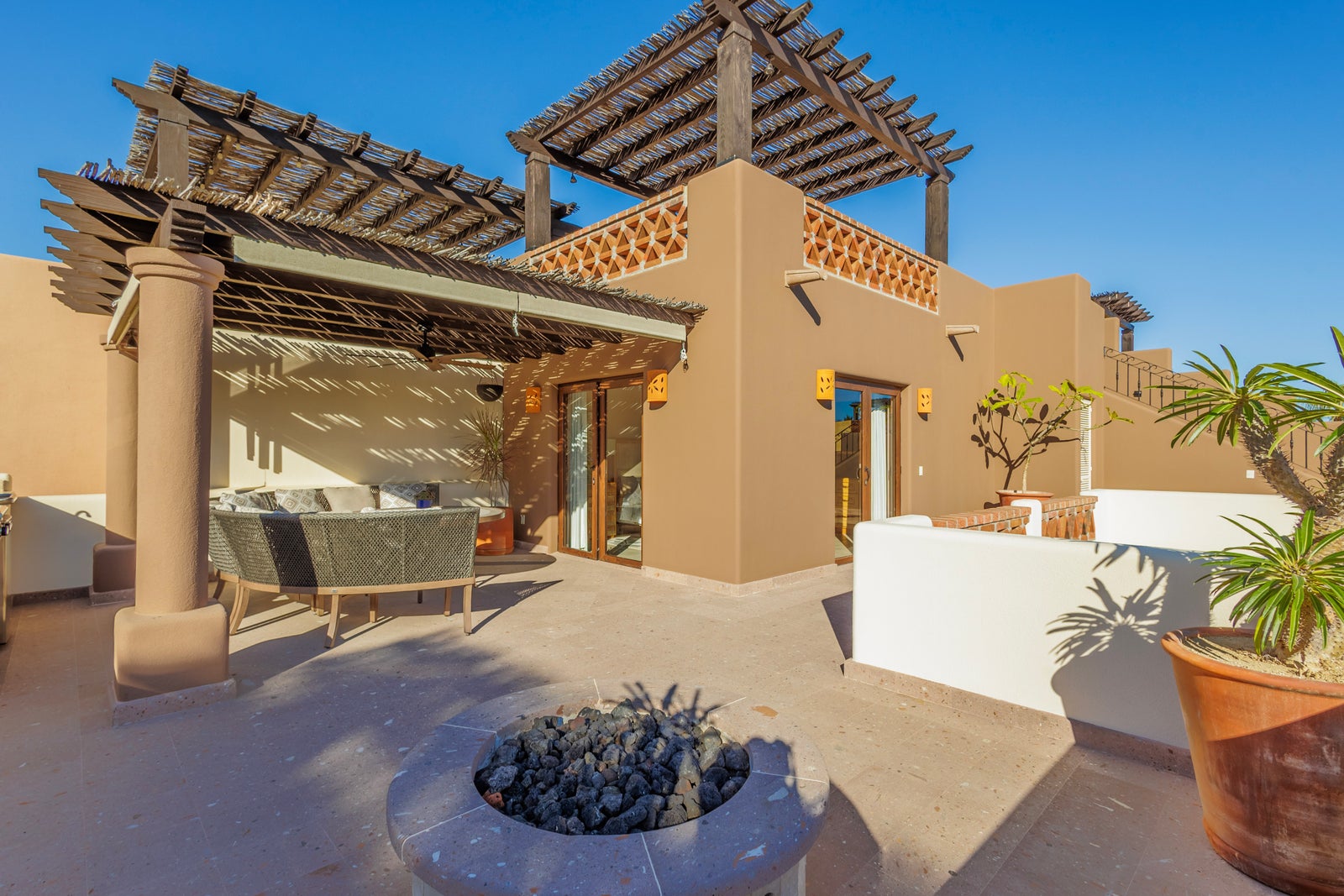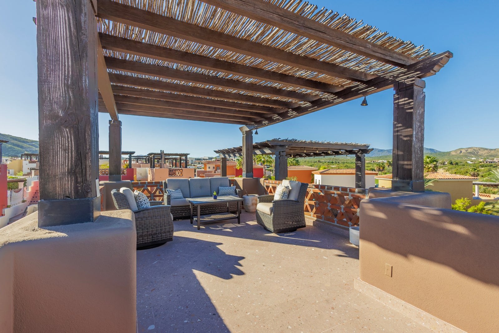 The upper roof deck is crowned by a handcrafted wooden pergola, creating a shaded retreat ideal for enjoying sunrise views over the Sea of Cortez and breathtaking desert mountain sunsets.