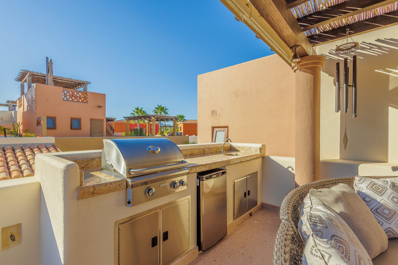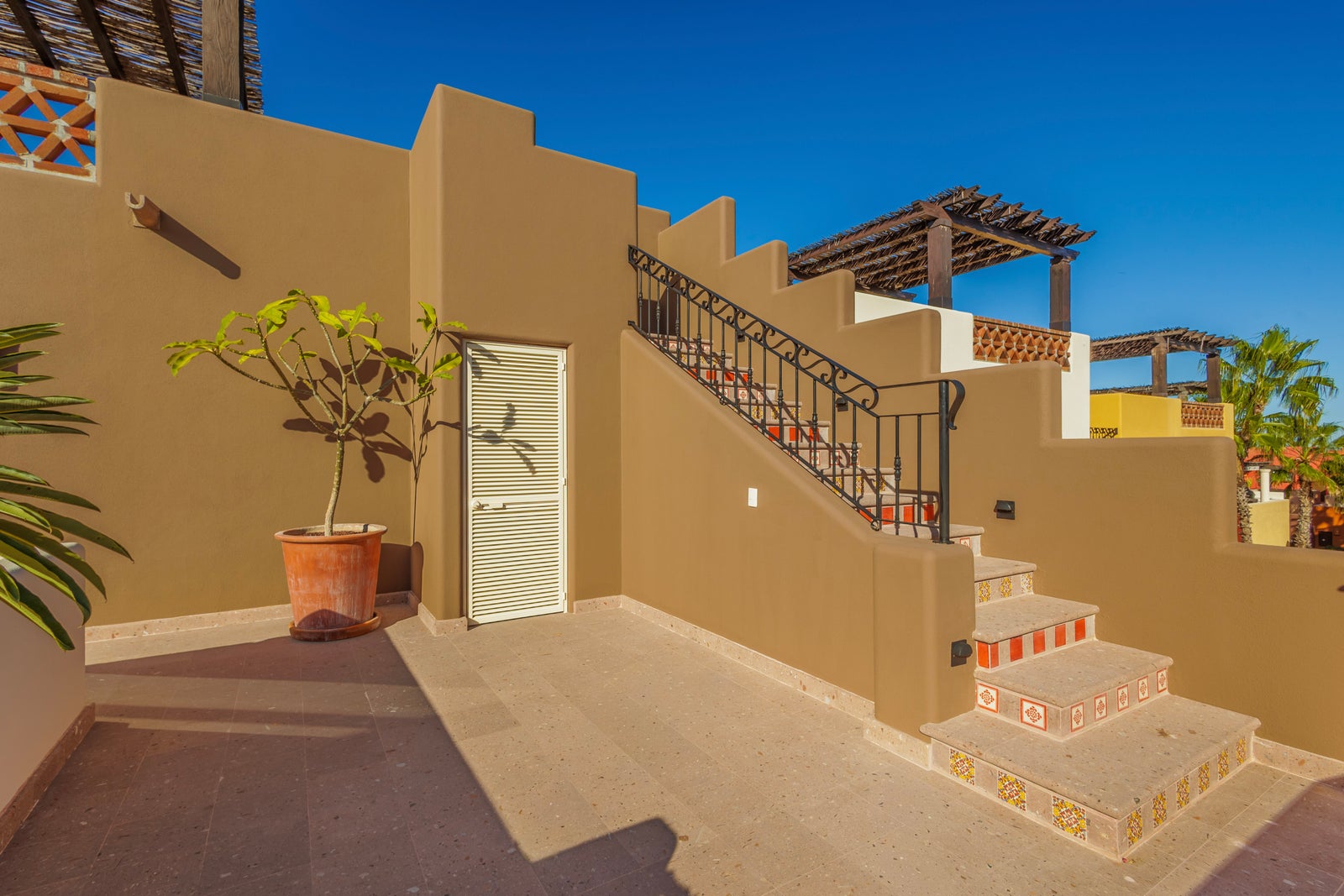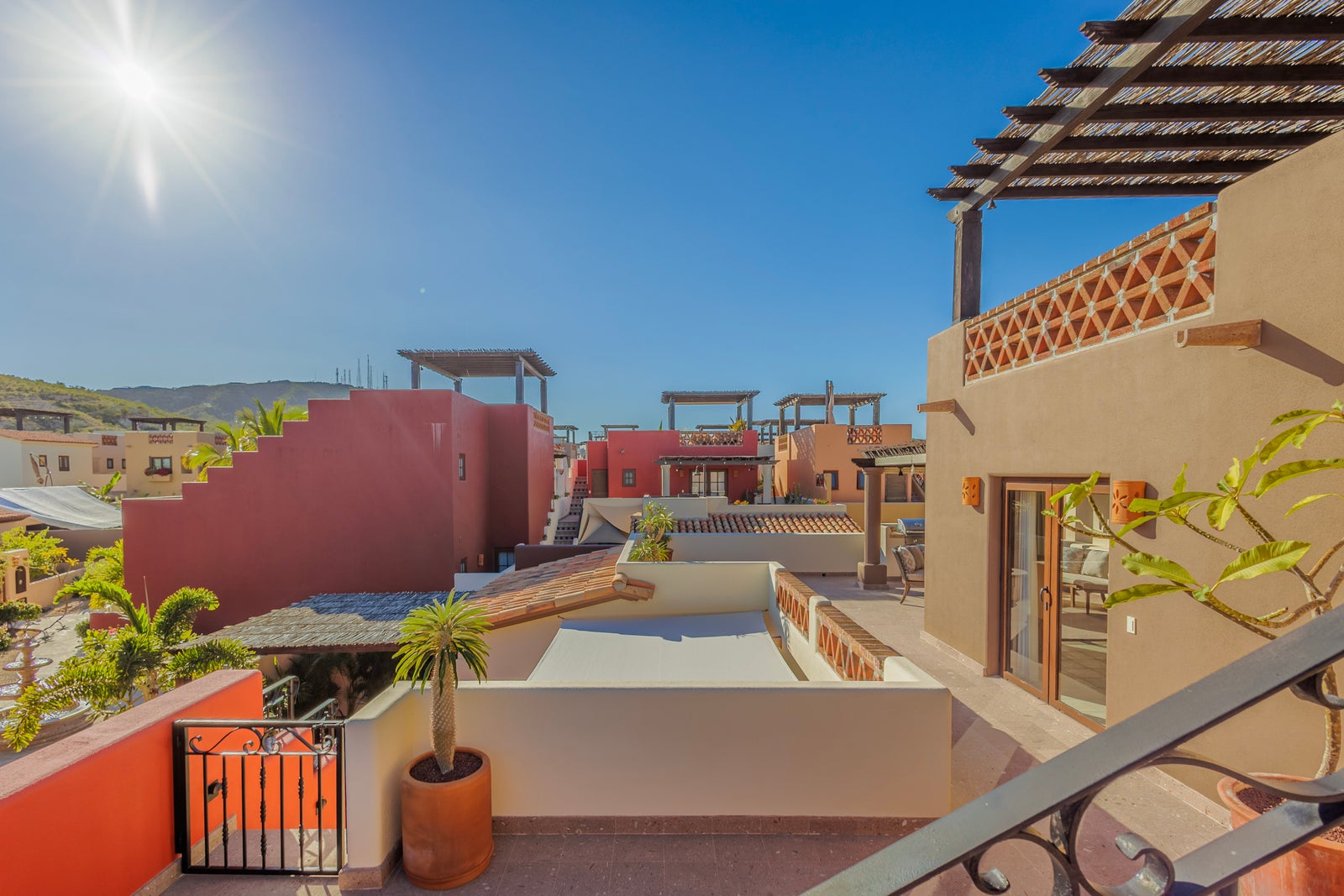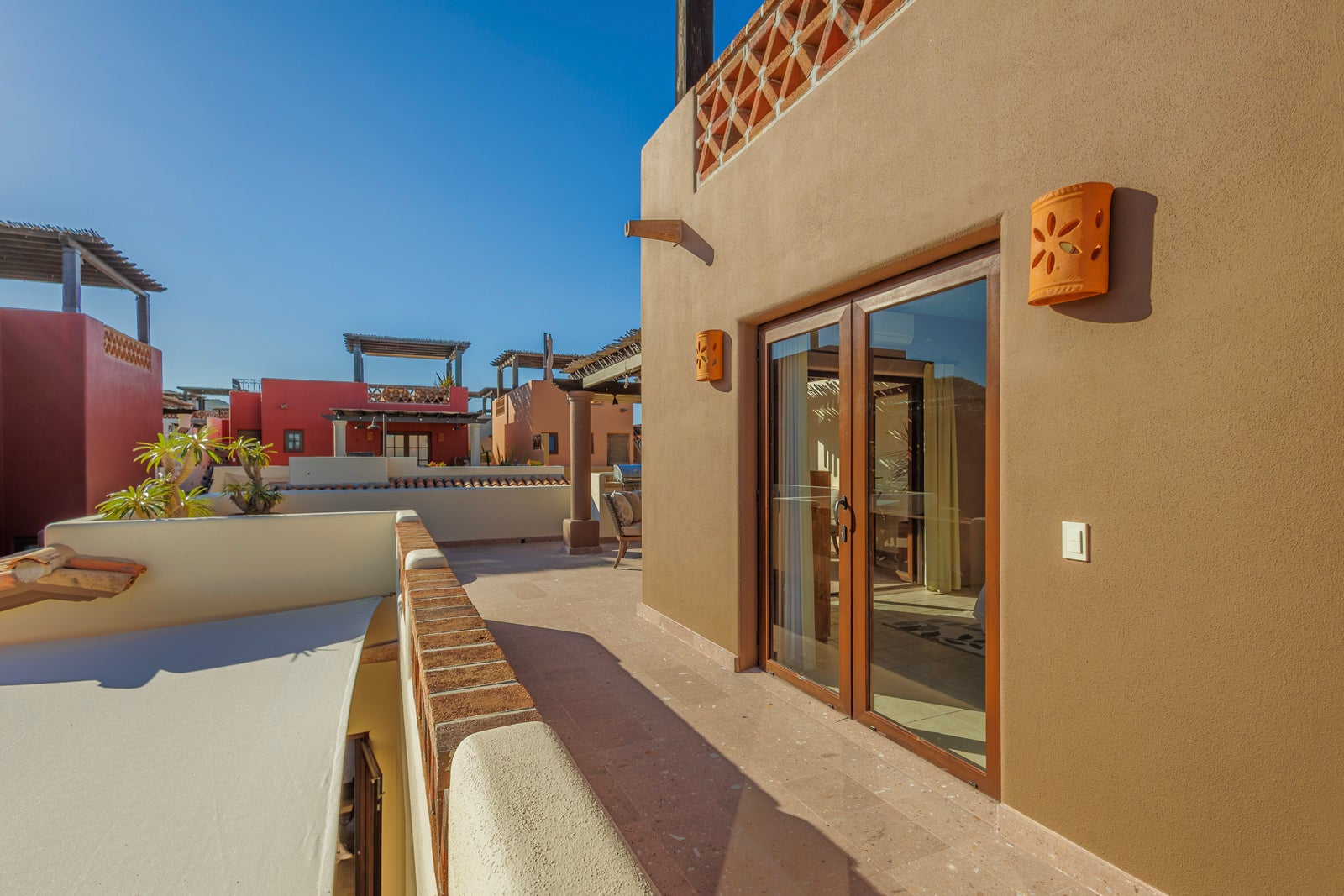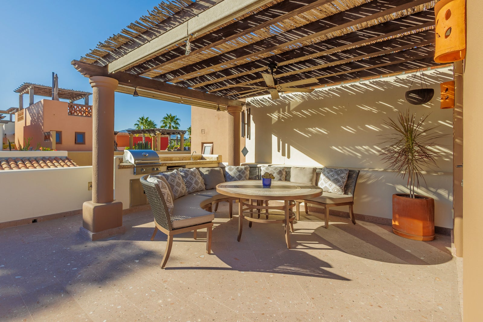 The upper roof deck is crowned by a handcrafted wooden pergola, creating a shaded retreat ideal for enjoying sunrise views over the Sea of Cortez and breathtaking desert mountain sunsets.