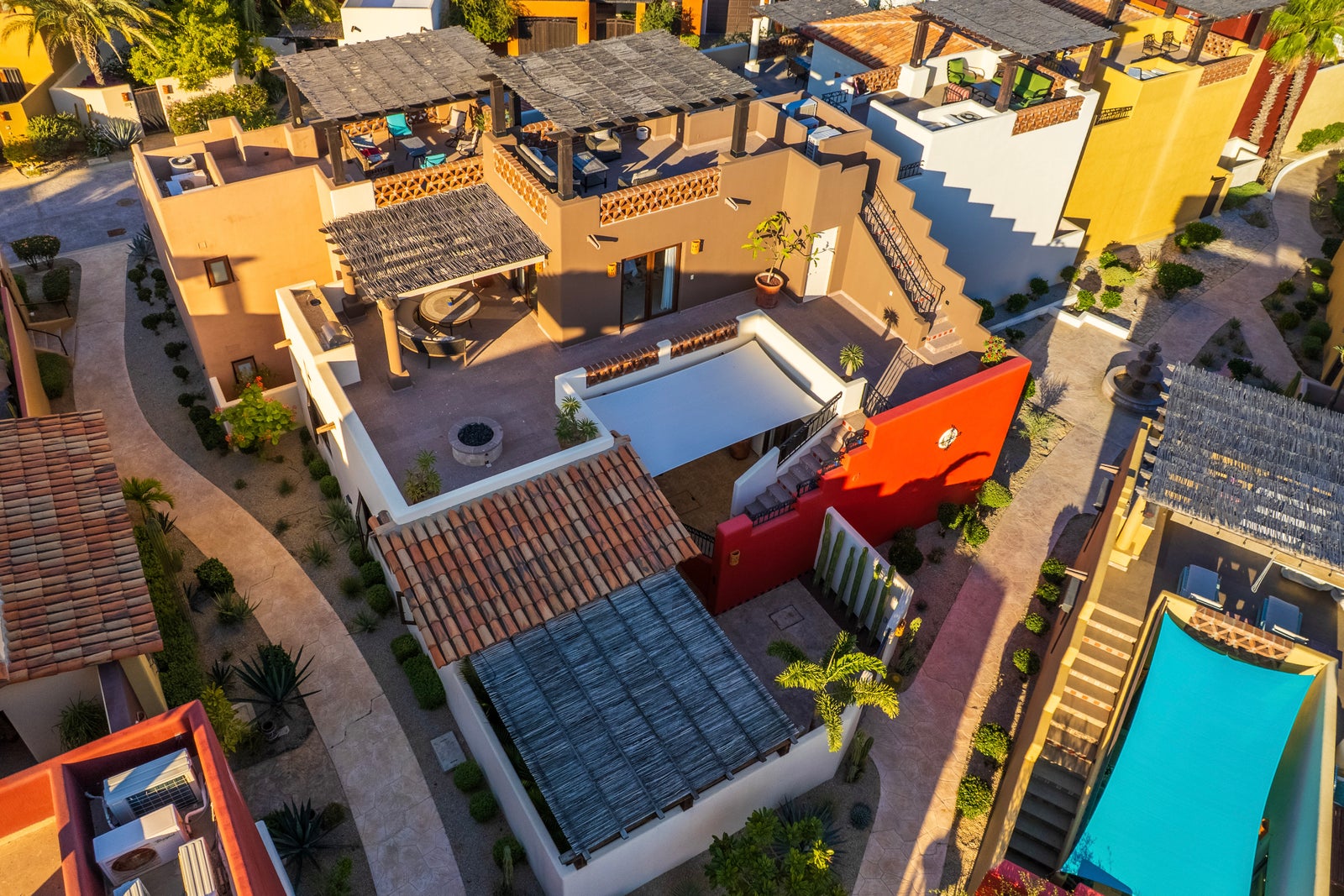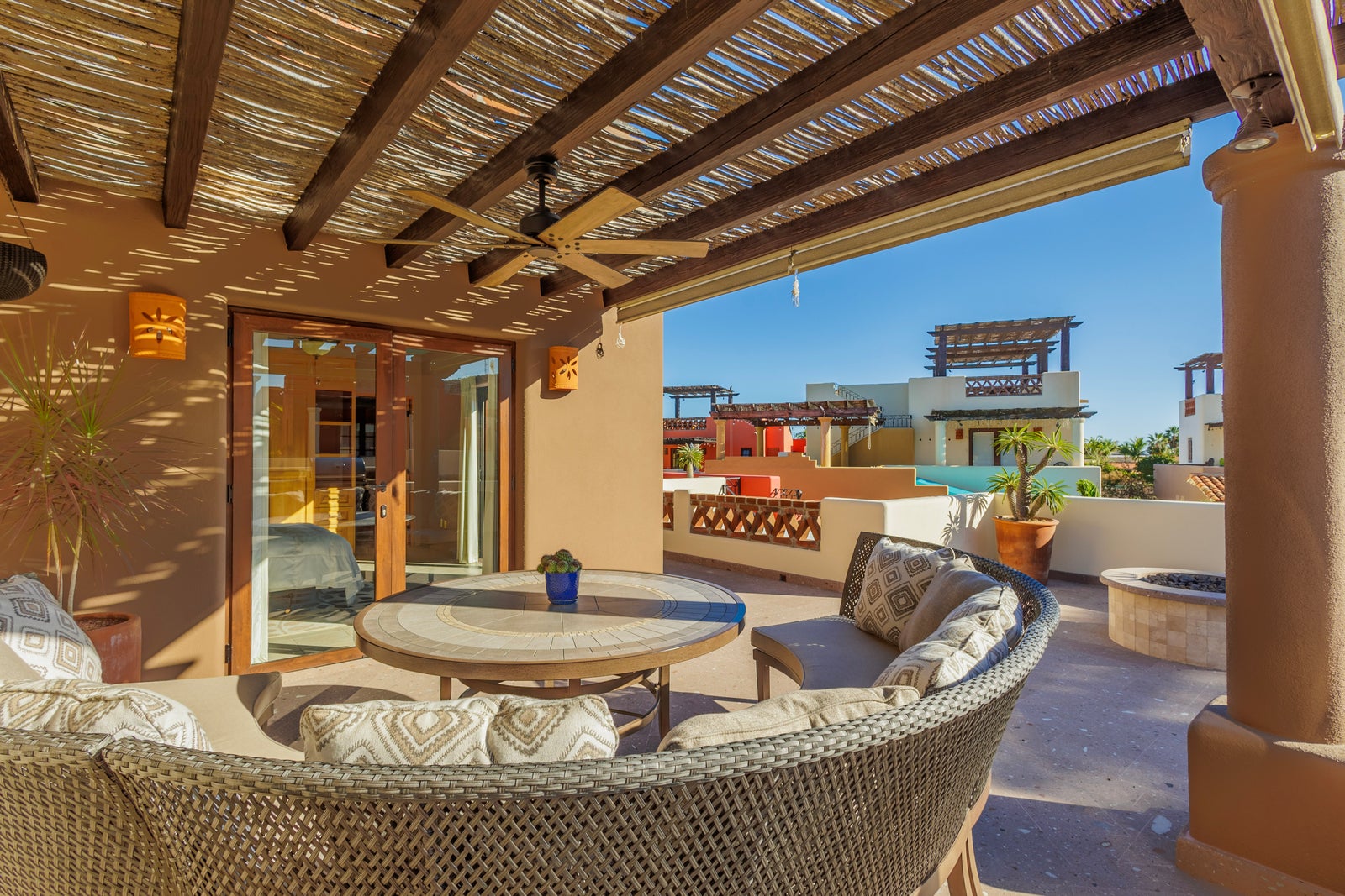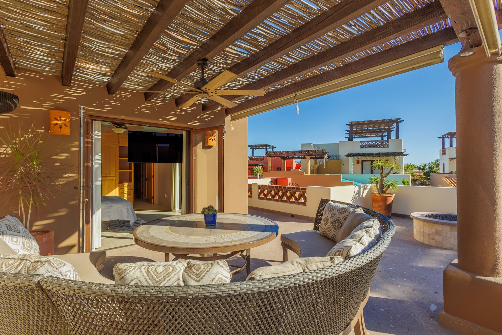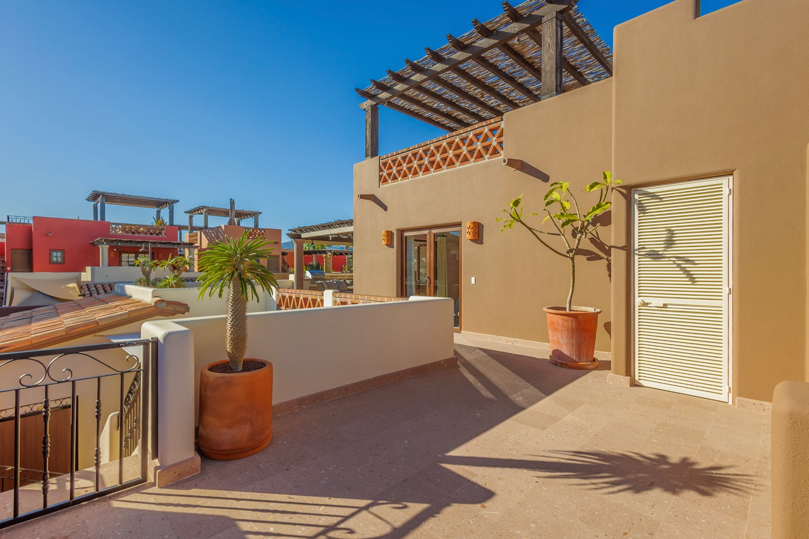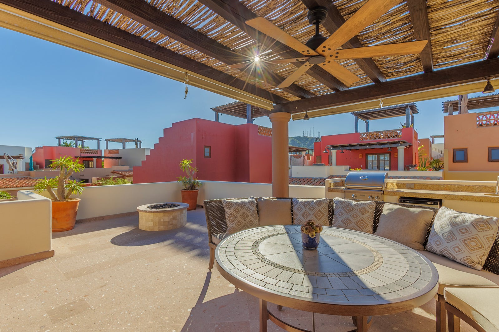 The upper roof deck is crowned by a handcrafted wooden pergola, creating a shaded retreat ideal for enjoying sunrise views over the Sea of Cortez and breathtaking desert mountain sunsets.