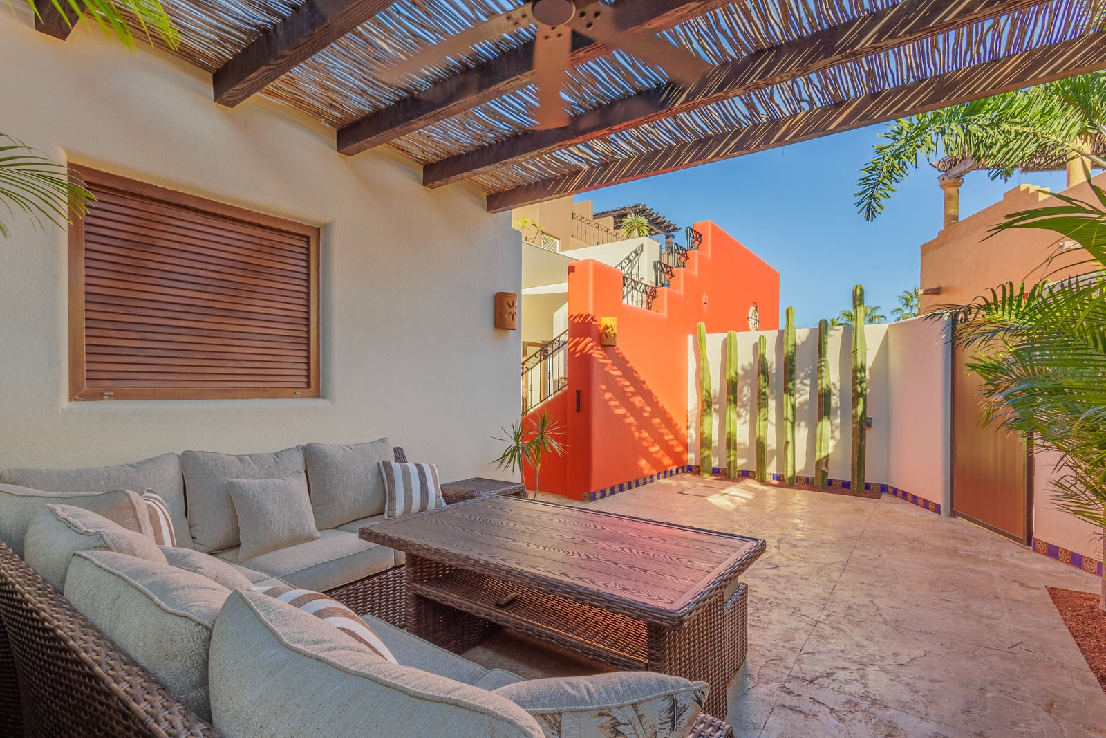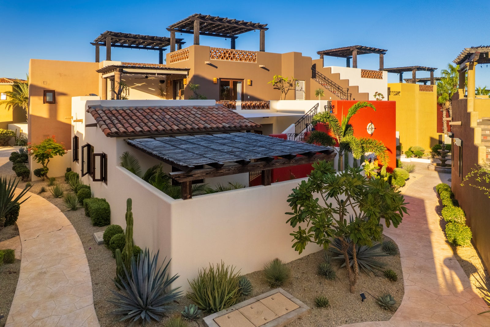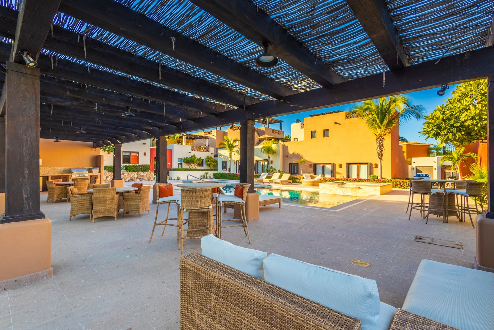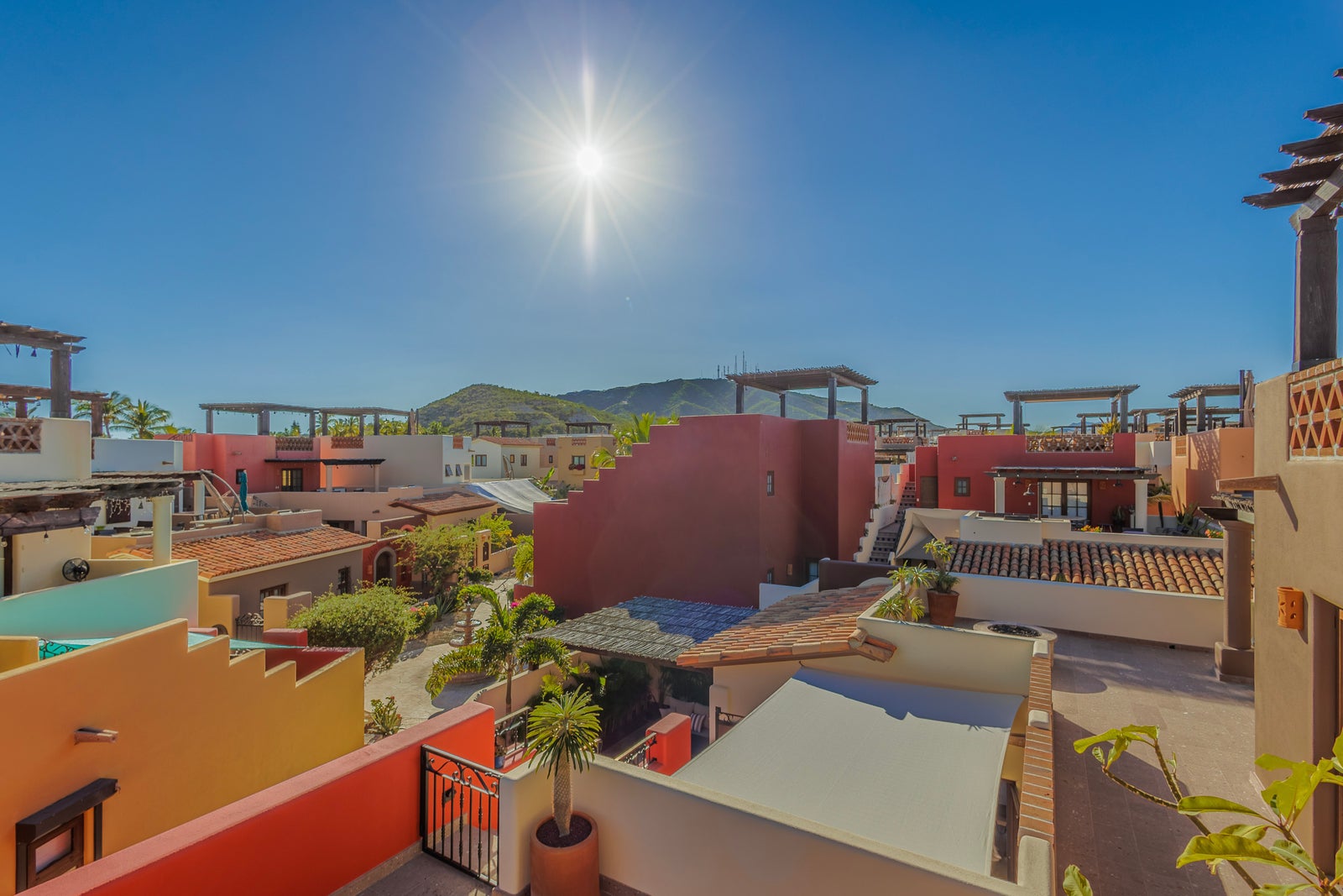 The upper roof deck is crowned by a handcrafted wooden pergola, creating a shaded retreat ideal for enjoying sunrise views over the Sea of Cortez and breathtaking desert mountain sunsets.