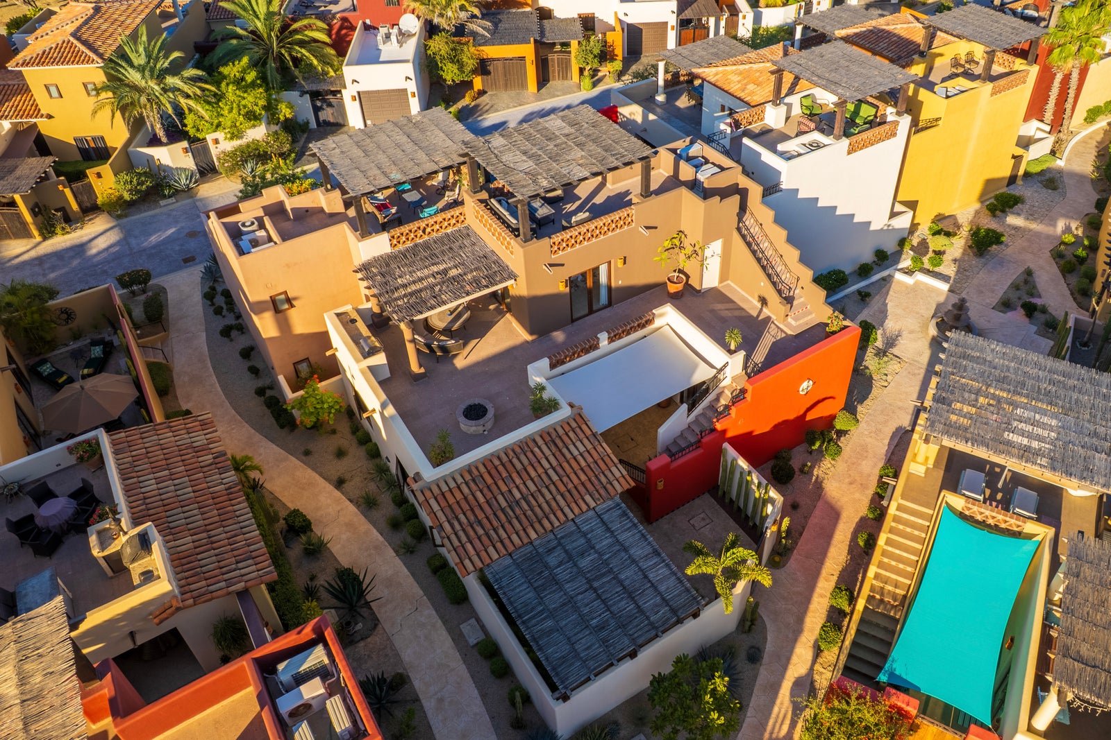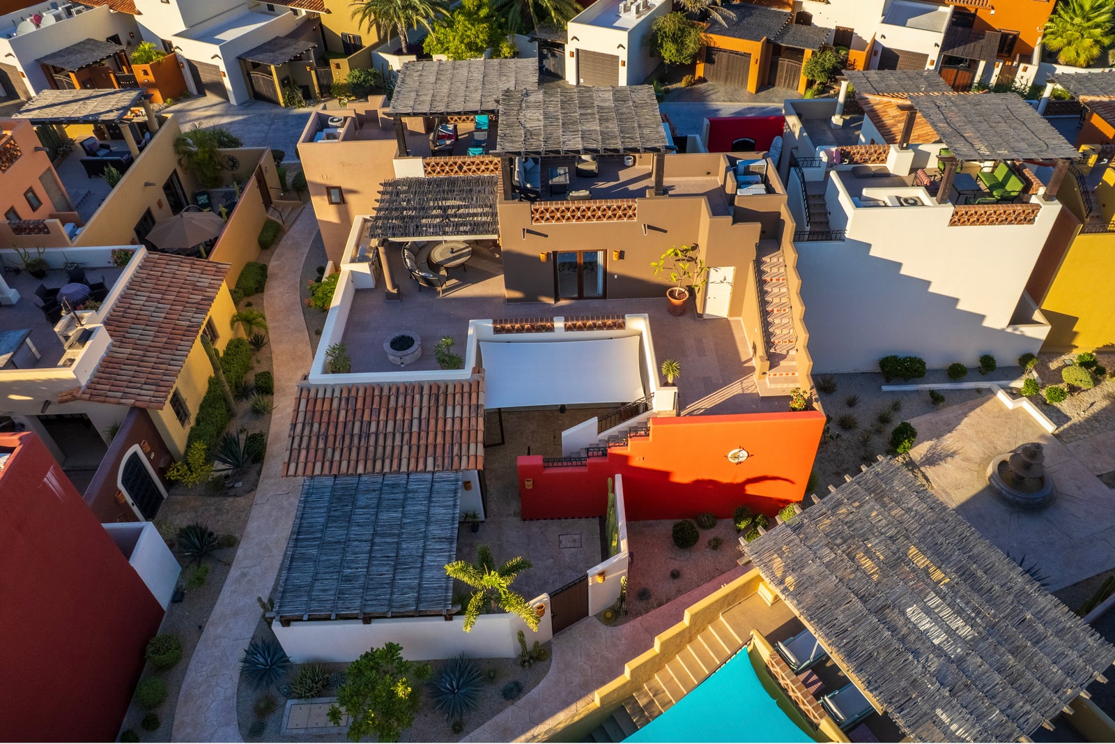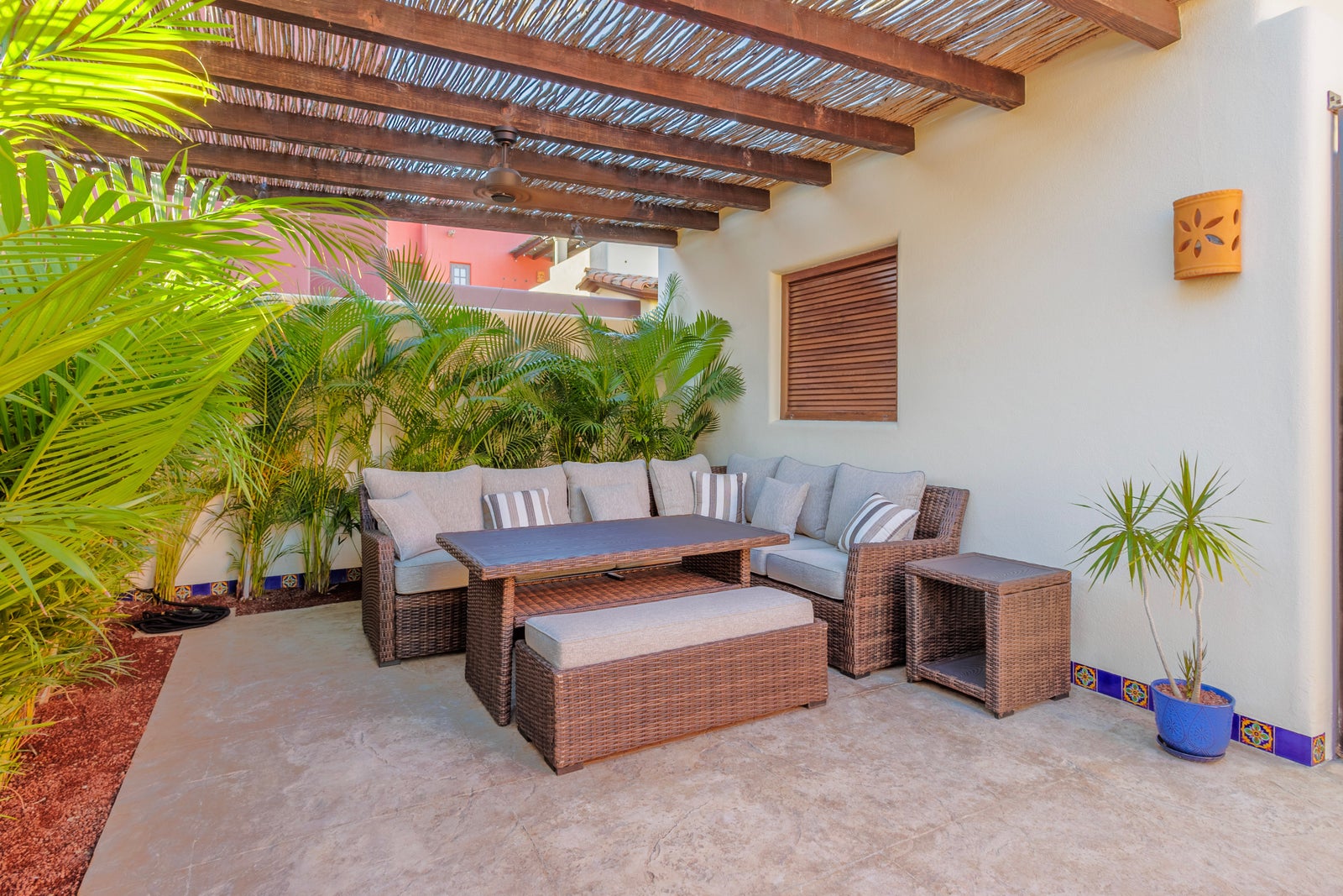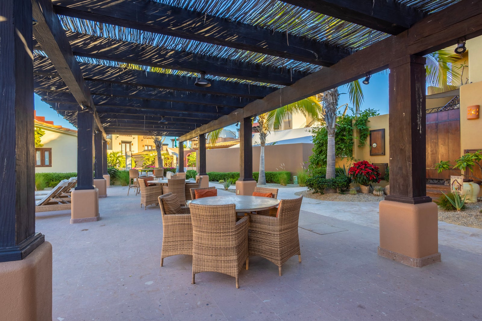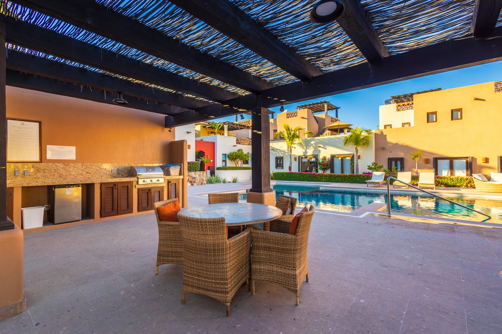 The upper roof deck is crowned by a handcrafted wooden pergola, creating a shaded retreat ideal for enjoying sunrise views over the Sea of Cortez and breathtaking desert mountain sunsets.
