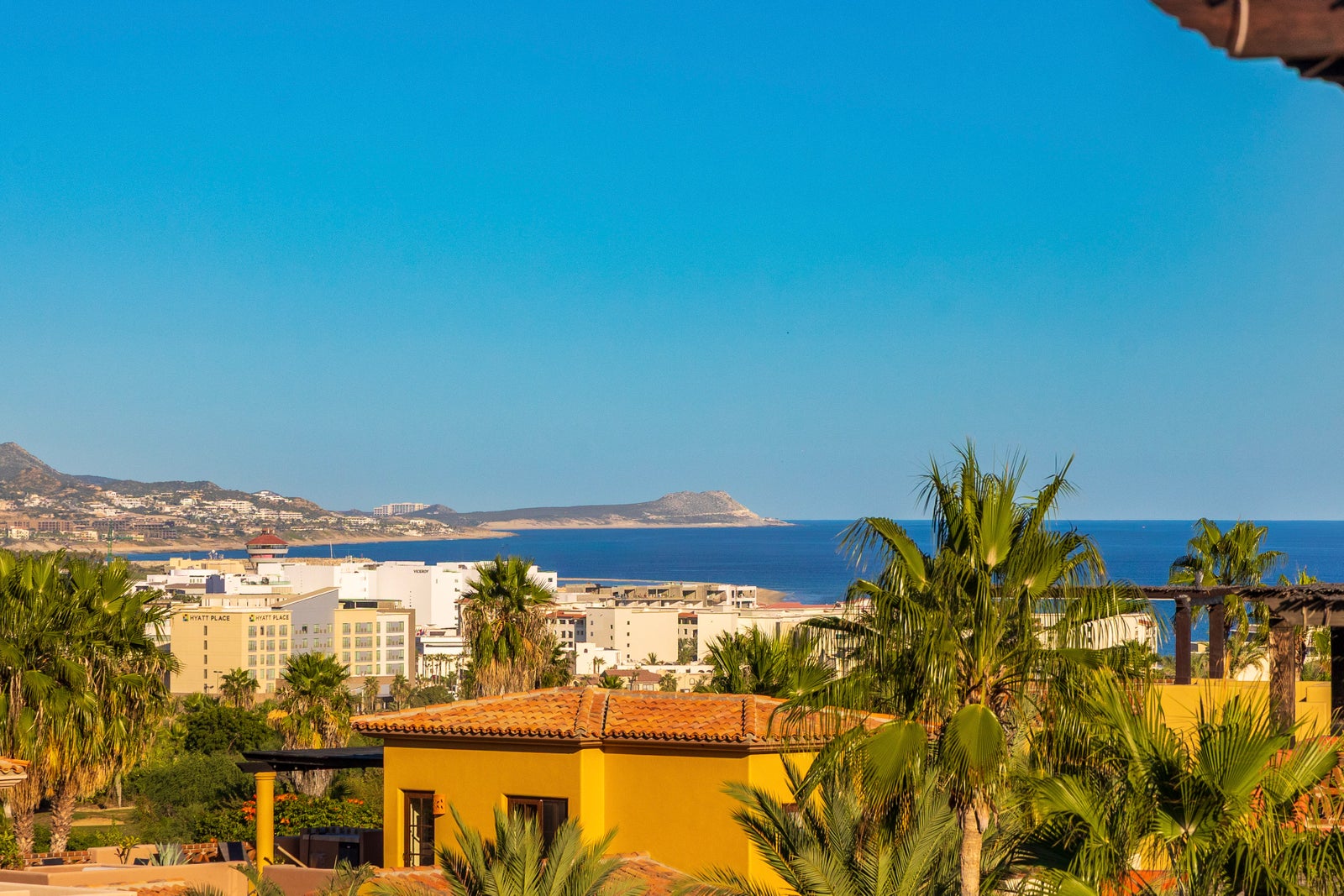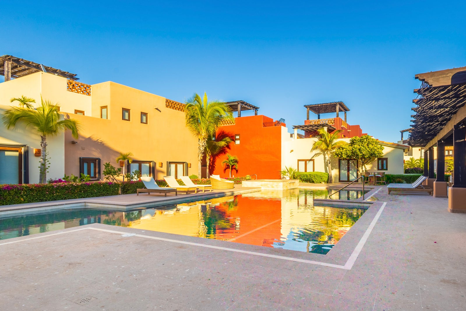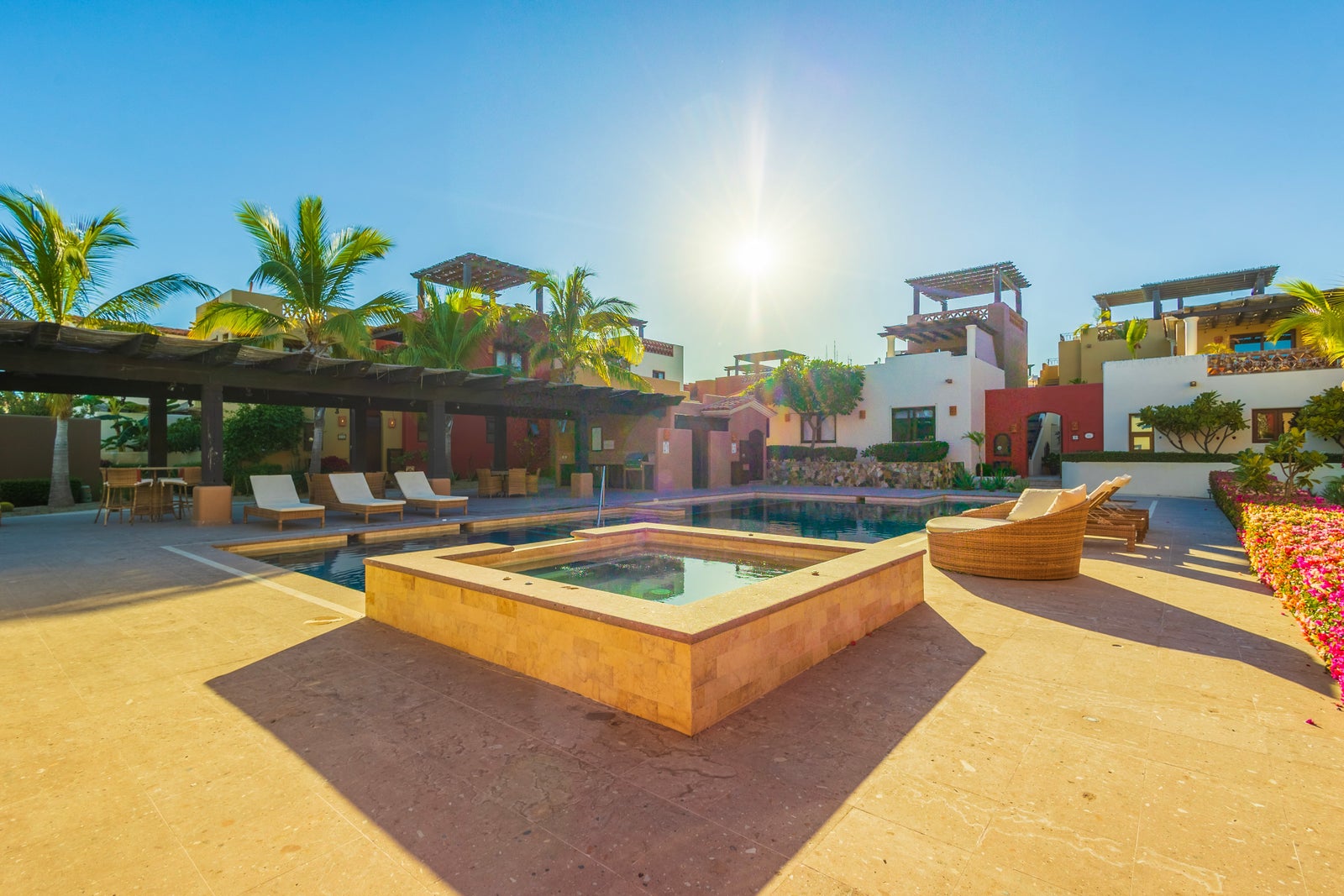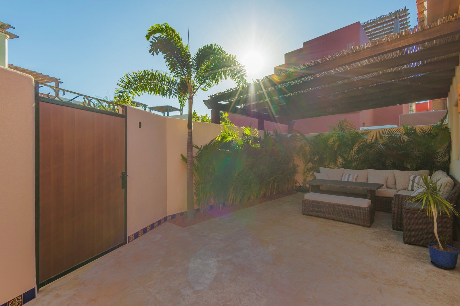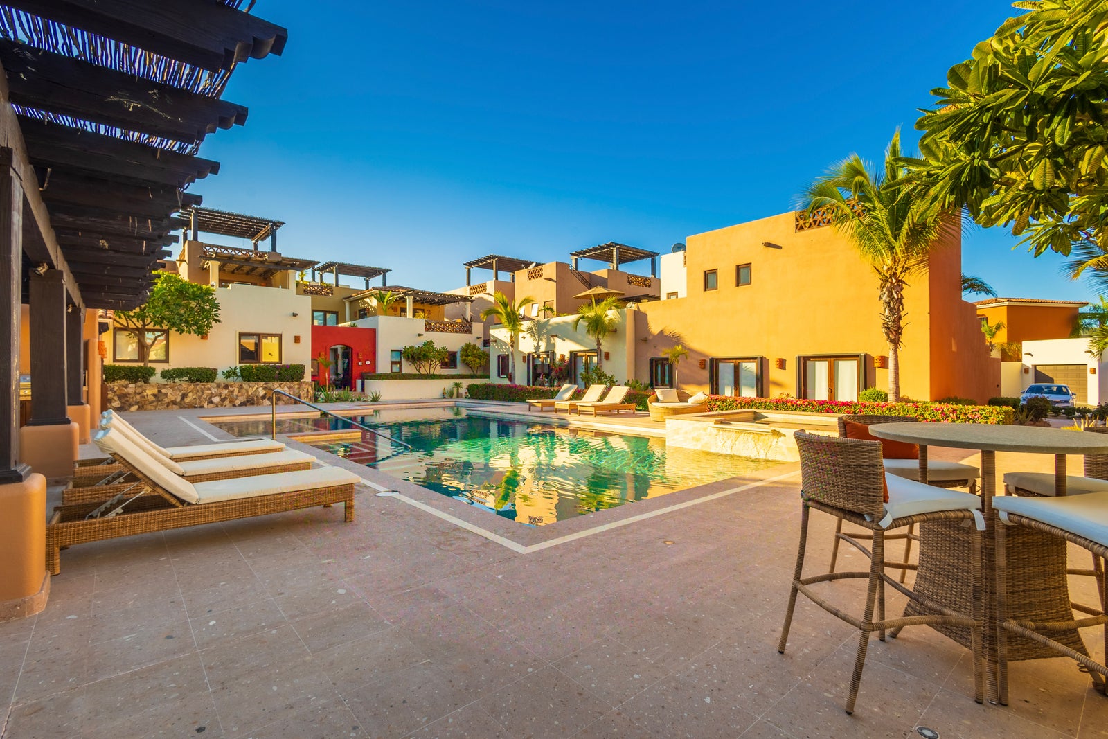 The upper roof deck is crowned by a handcrafted wooden pergola, creating a shaded retreat ideal for enjoying sunrise views over the Sea of Cortez and breathtaking desert mountain sunsets.