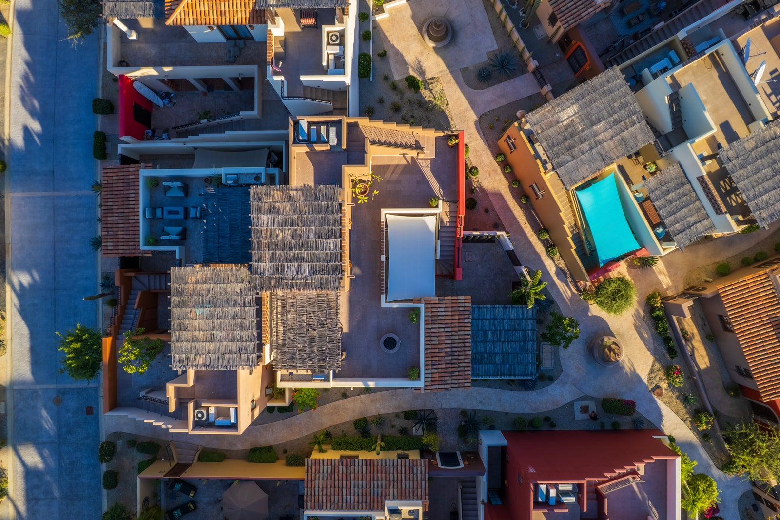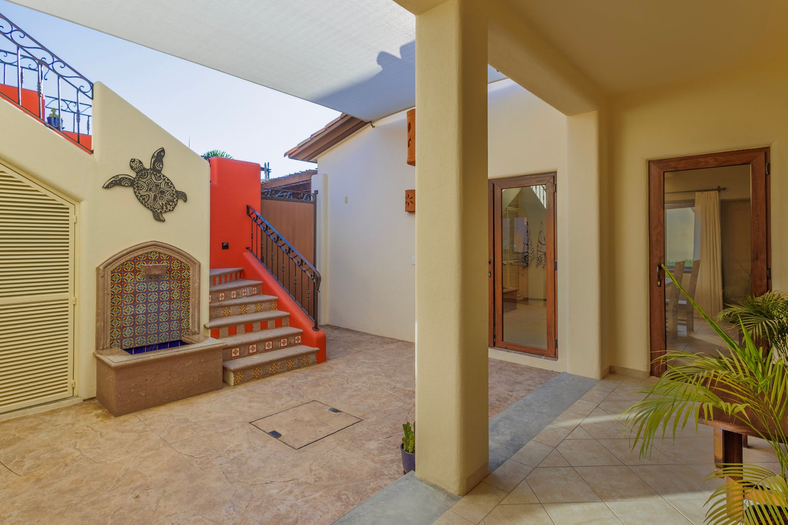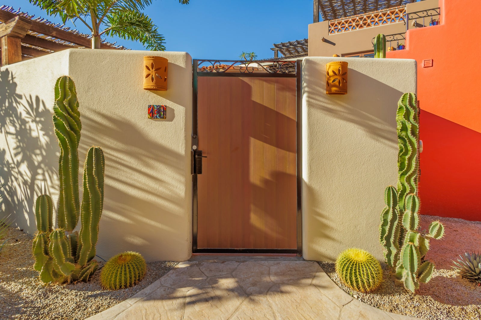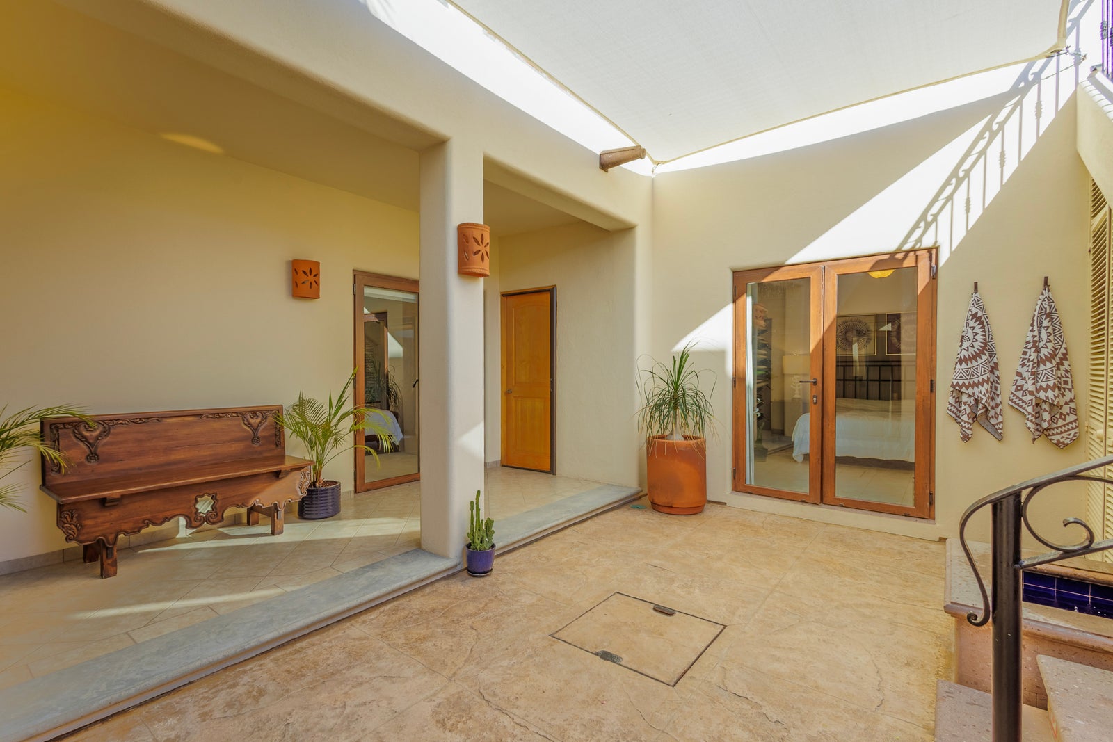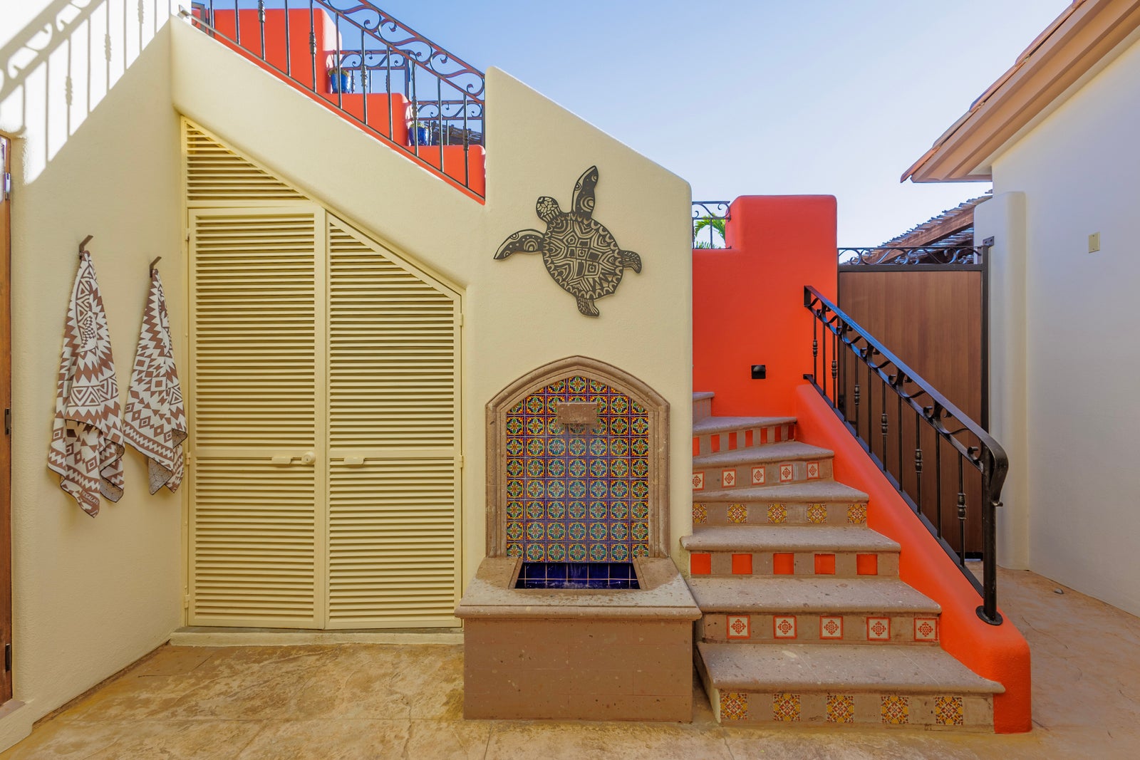 The upper roof deck is crowned by a handcrafted wooden pergola, creating a shaded retreat ideal for enjoying sunrise views over the Sea of Cortez and breathtaking desert mountain sunsets.