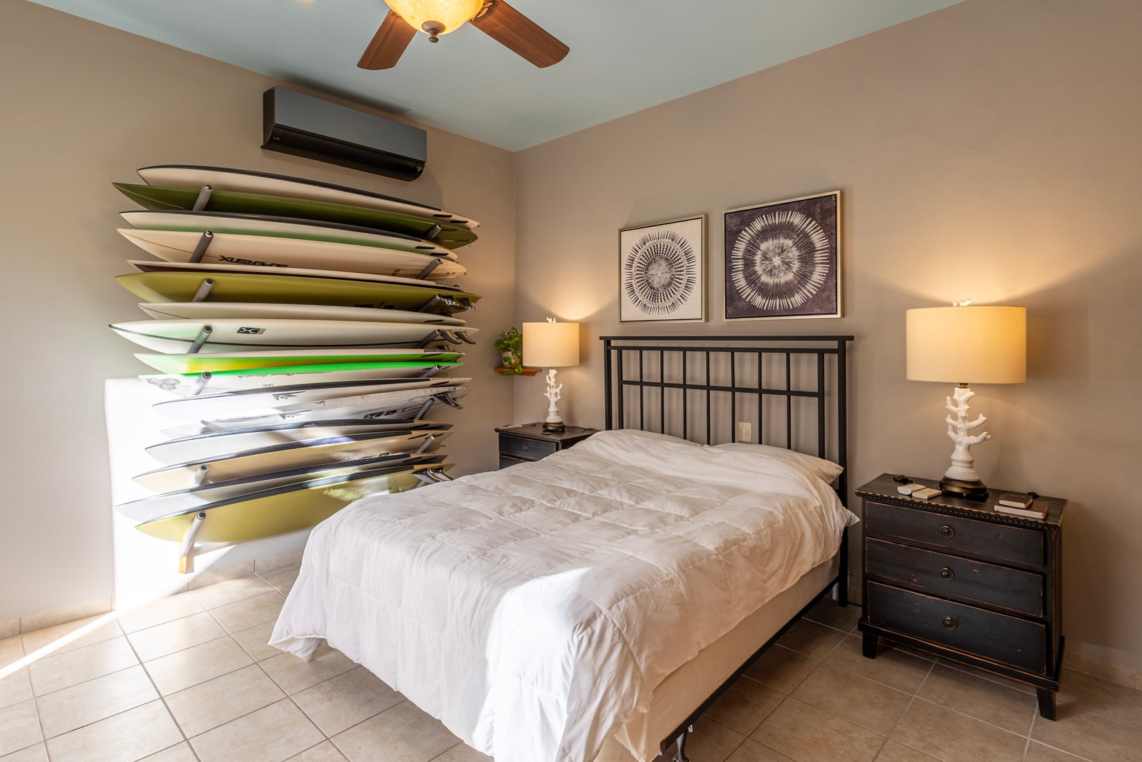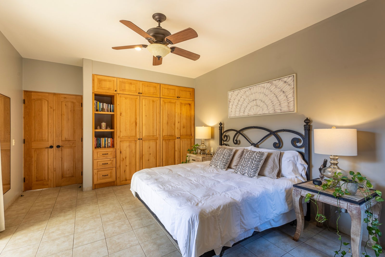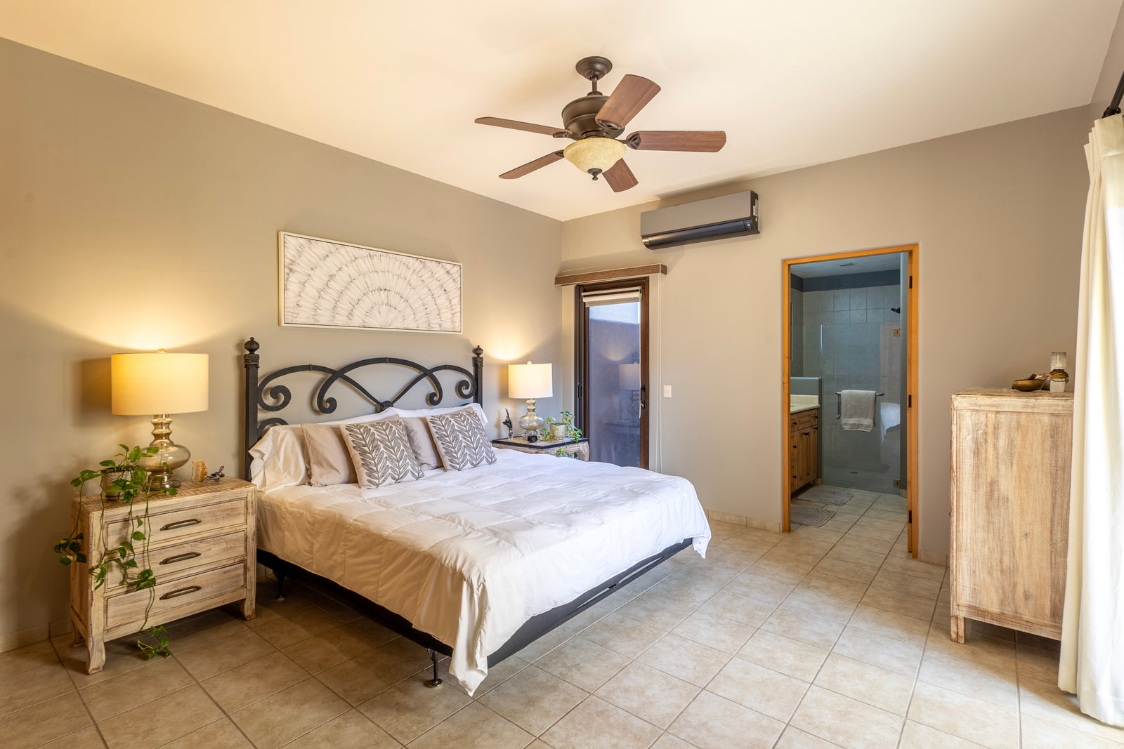The primary bedroom is conveniently located on the ground level and comfortably accommodates king sized furnishings. It features custom built-in cabinetry, abundant storage, and a spacious ensuite bathroom. A second bedroom on the main level also includes a private ensuite with a relaxing soaker tub.