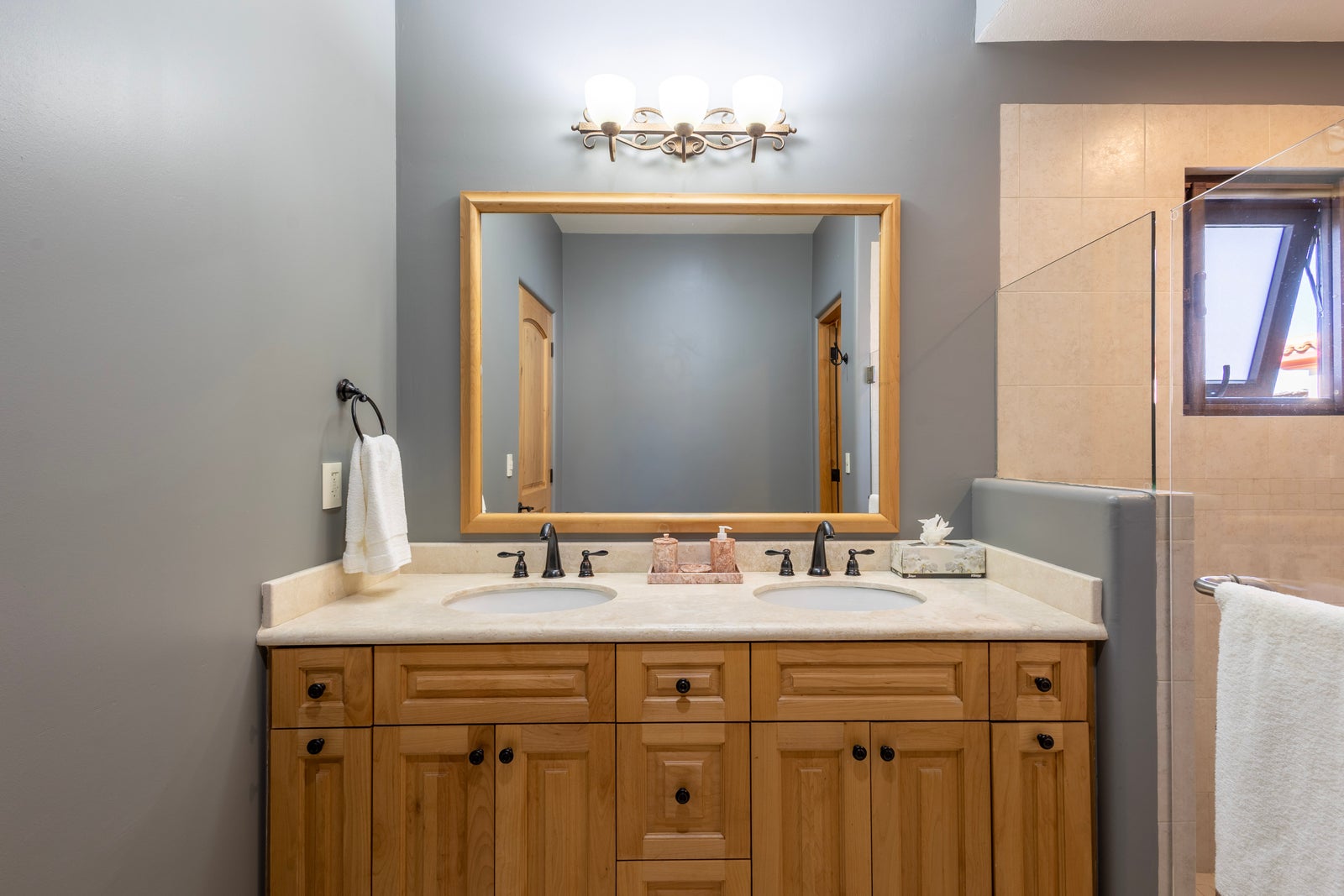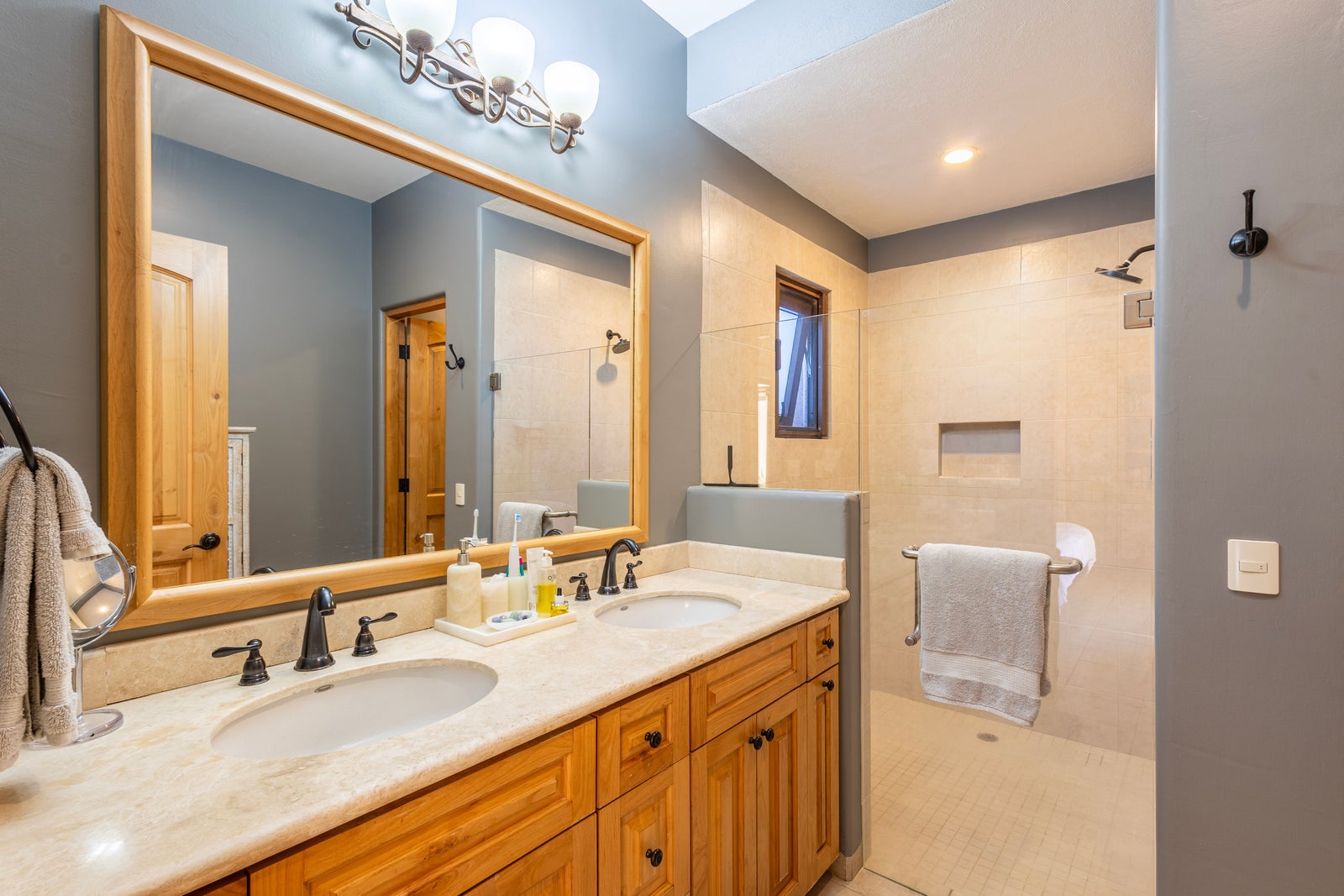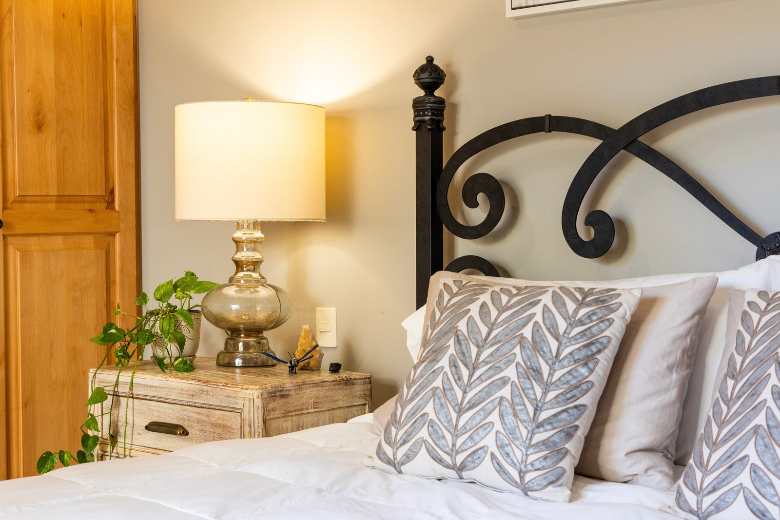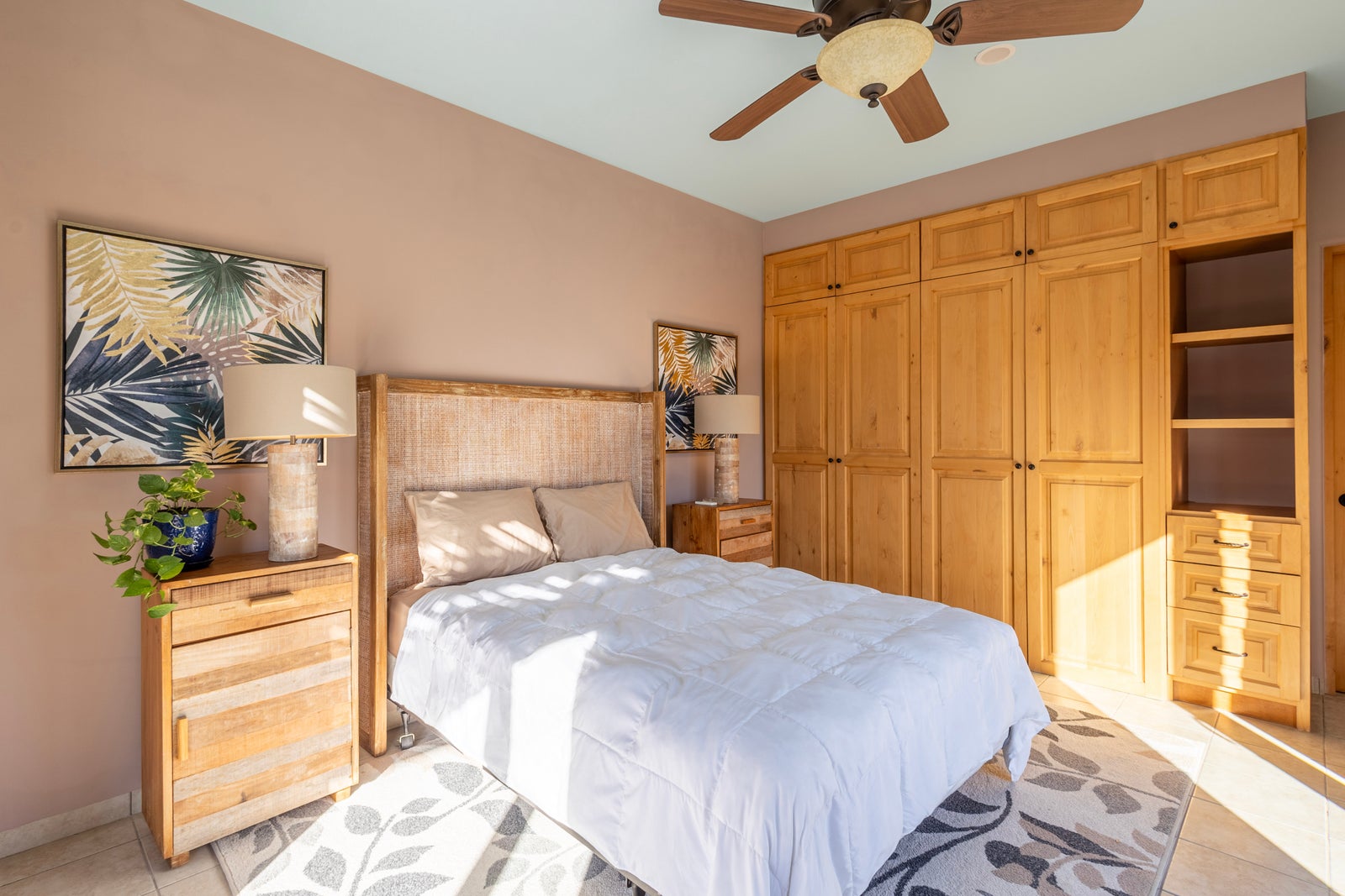 The primary bedroom is conveniently located on the ground level and comfortably accommodates king sized furnishings. It features custom built-in cabinetry, abundant storage, and a spacious ensuite bathroom. A second bedroom on the main level also includes a private ensuite with a relaxing soaker tub.