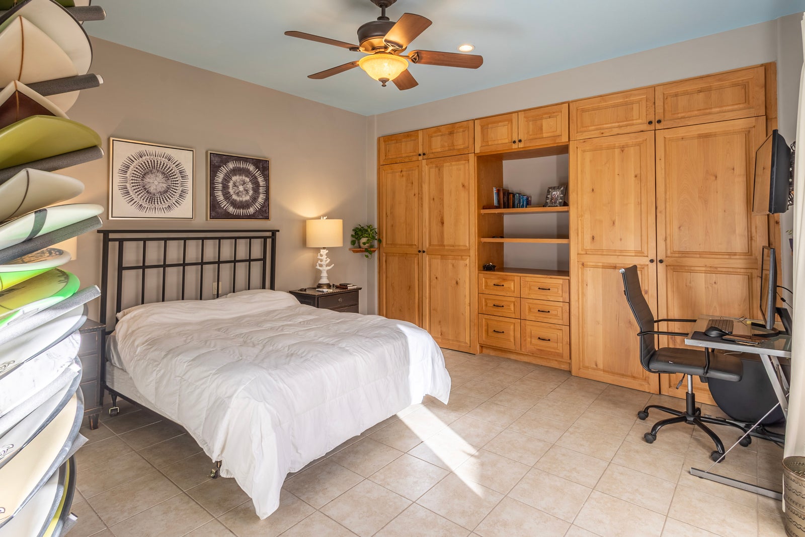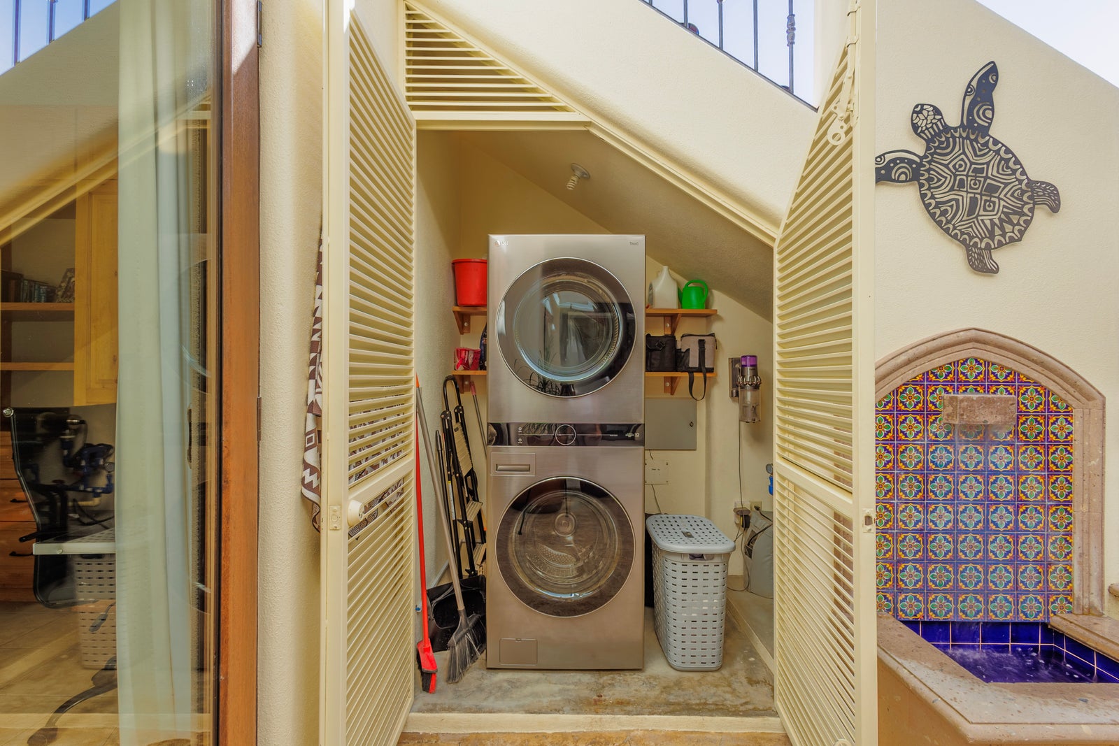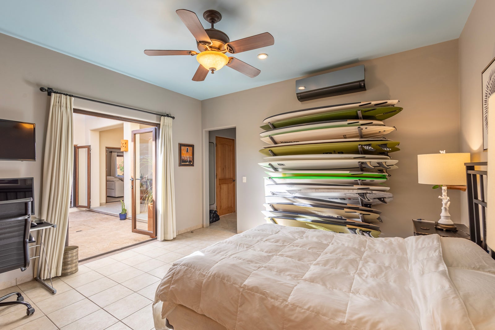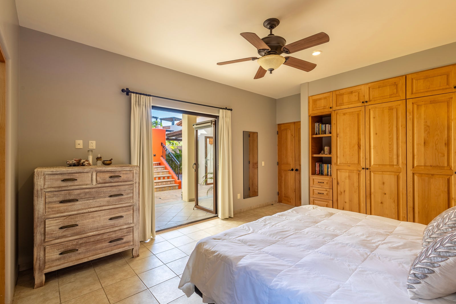 An exterior courtyard staircase leads to the second level, where you’ll find an additional large bedroom with a full bathroom and private entry—offering excellent privacy for guests. This level also features a spacious lounge area complete with an outdoor kitchen and built-in grill, perfect for entertaining and BBQ enthusiasts.