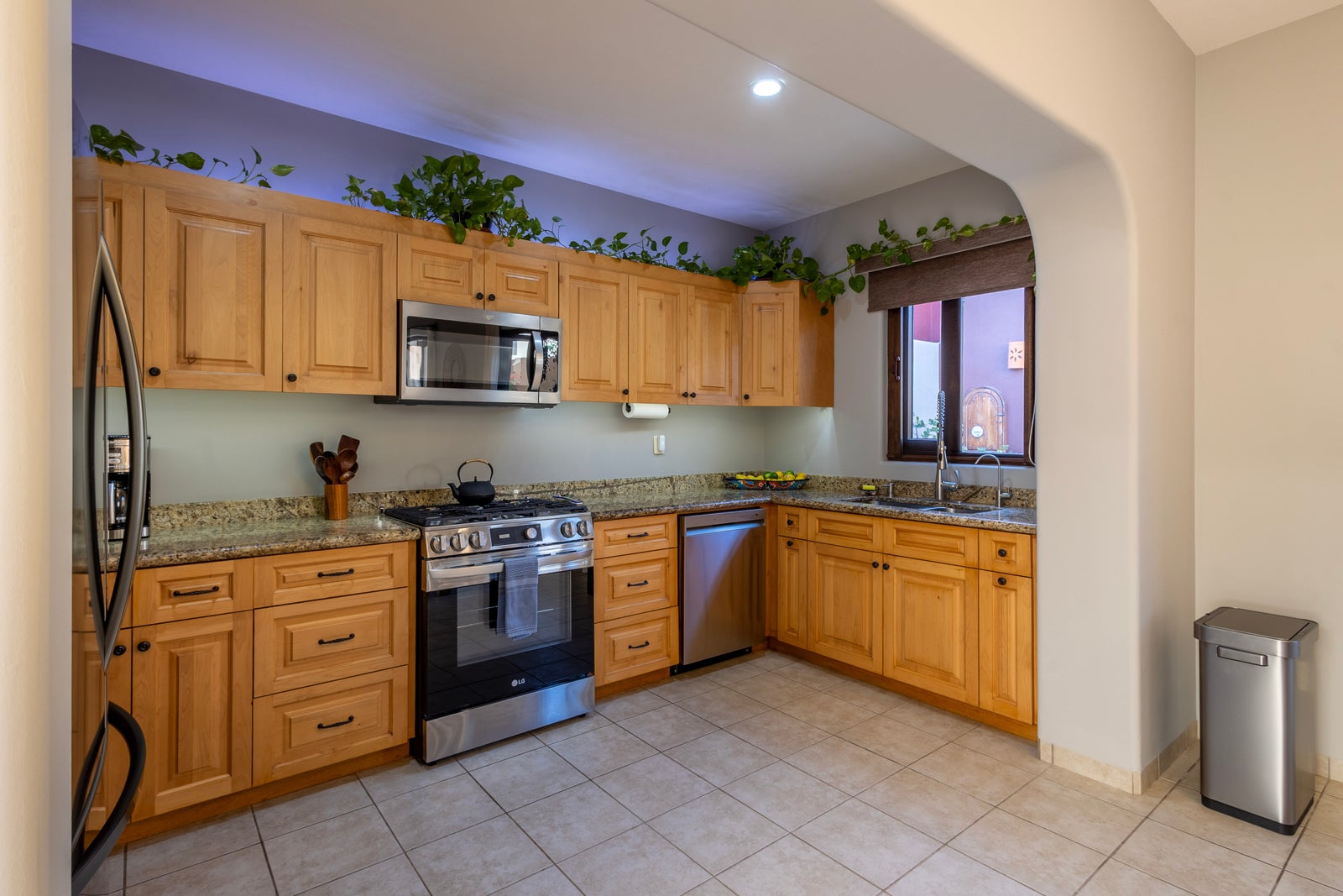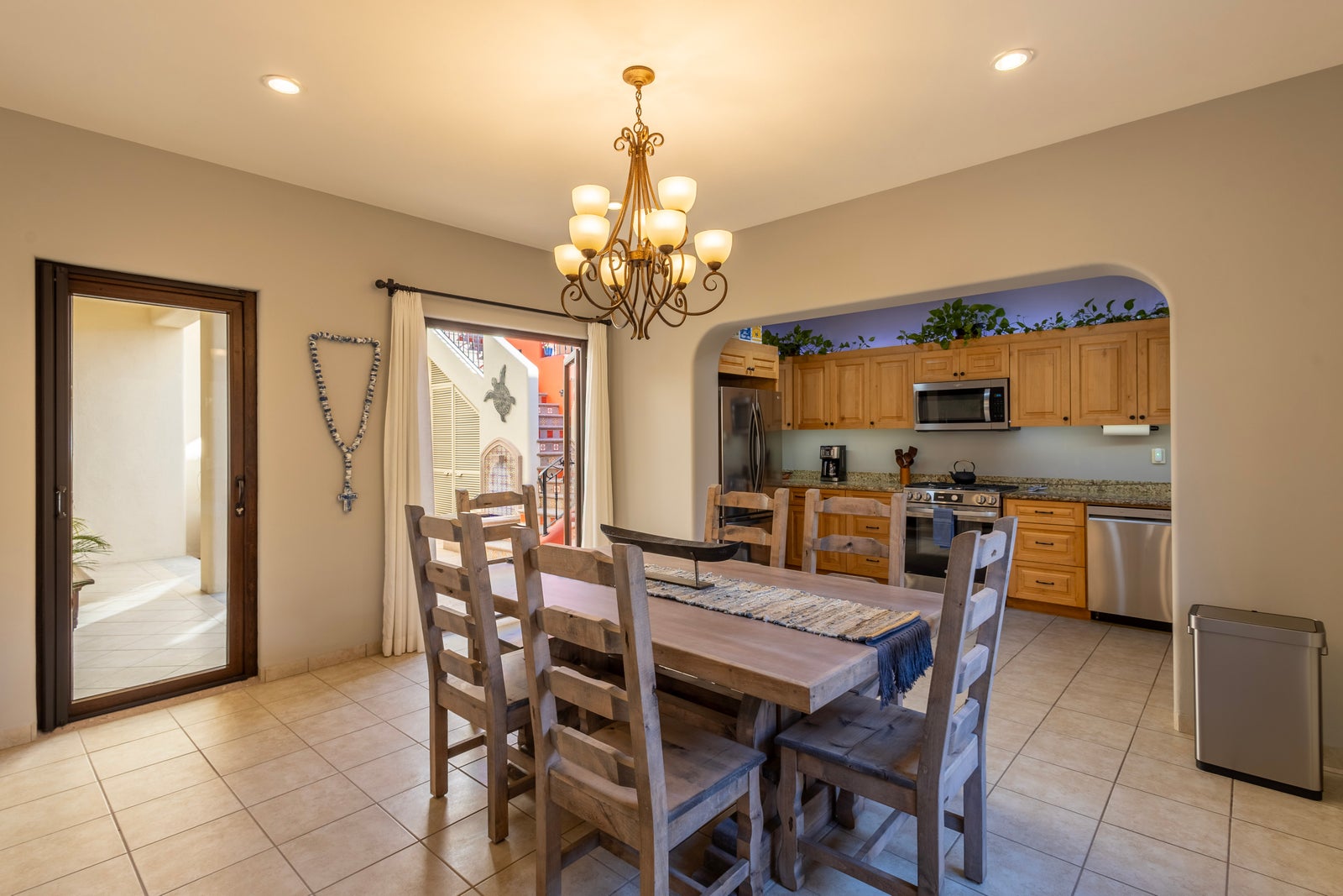 Upon entering the beautifully manicured courtyard, you’re greeted by the sounds of the tranquil fountain and you will be impressed with ample space to relax and unwind. French doors lead into an open-concept living area highlighted by a clean, minimalist interior design. The living room provides generous space for comfortable entertaining, while the adjacent dining area is ideal for hosting memorable gatherings. The expansive kitchen is equipped with top-of-the-line stainless steel appliances, abundant counter space, and ample storage.